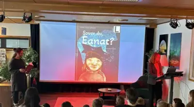 Eventyrstund med boken "Sover du, Eanat?" Lest av bibliotekssjef Monica Isobel Glenna og avdelingsleder ved Måsøy museum Kristine M. Håkenåsen. Renee Beate Andersen - 15/16